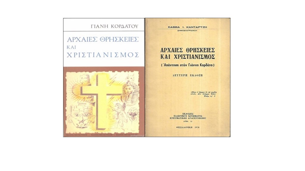 Το 1957 εκδίδεται, για πρώτη φορά το έργο του Σάββα Ι. Κανταρτζή, ως αντίλογος προς τον Κορδάτο με ίδιο τίτλο, αλλά με την επιπλέον επεξήγηση: «Απάντηση στον Γ. Κορδάτο». Ο Κανταρτζής γράφει το βιβλίο του, επιχειρηματολογώντας υπέρ μίας χριστιανικής παράδοσης, σε αντιδιαστολή με την ιστορικο-κοινωνική κριτική προσέγγιση του Κορδάτου. Εξετάζει, αναλύει και αντιπαραθέτει στοιχεία ιστορικά, θεολογικά και φιλοσοφικά στα επιχειρήματα του Κορδάτου. Το βιβλίο προβάλλει ότι οι αρχαίες θρησκείες δεν μπορούν να εξομοιωθούν πλήρως ή να αποδοθούν μόνο μέσω κοινωνικό-υλιστικών οπτικών· τονίζει τον μεταφυσικό, θρησκευτικό και θεολογικό χαρακτήρα της θρησκείας ο οποίος υποβαθμίζεται από τον Κορδάτο.